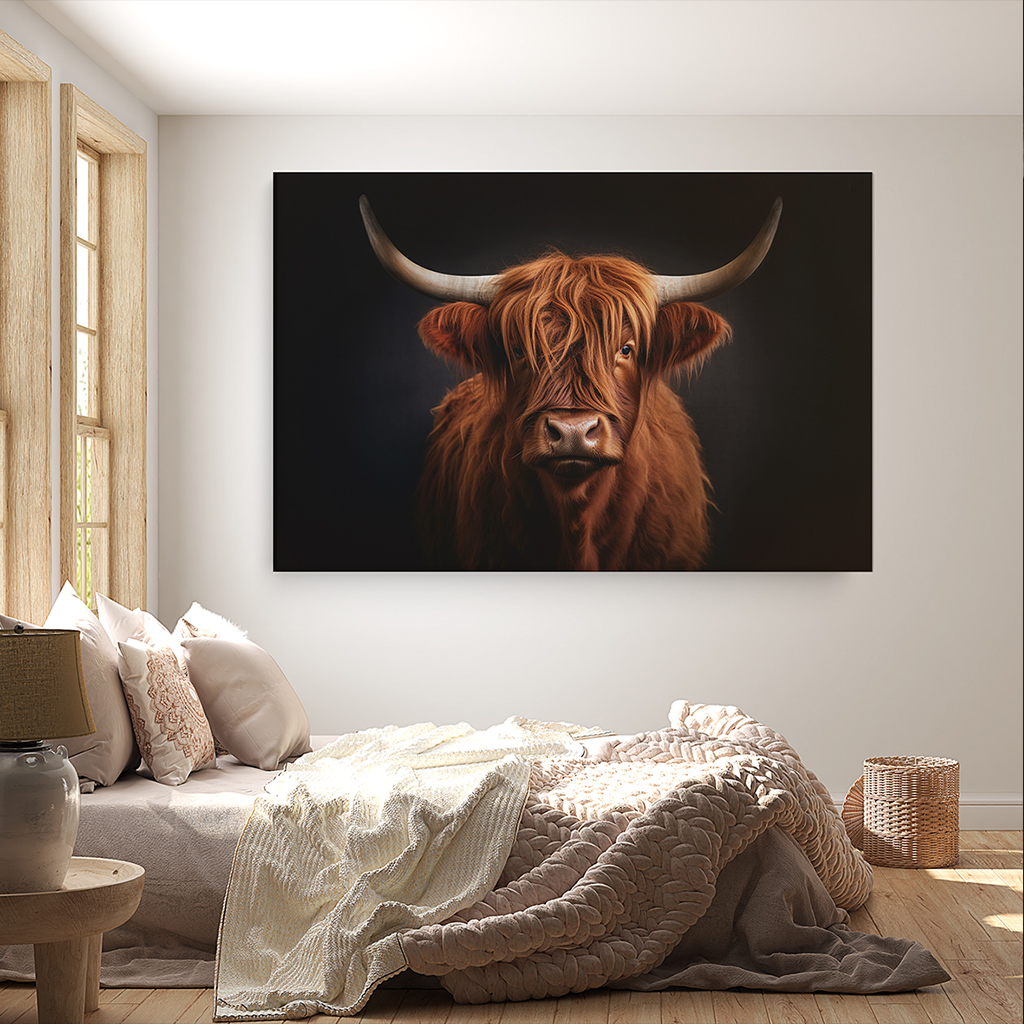 Het canvas schilderij met een rood bruine Schotse Hooglander tegen een zwarte achtergrond is onderdeel van de collectie dieren schilderijen op canvas. Dit stoere Schotse hooglander schilderij op canvas is een echte eyecatcher voor elk interieur. Het krachtige portret van een rood bruine schotse hooglander op canvas, geeft je muur direct karakter. Het schilderij Schotse hooglander canvas laat de robuuste charme van het dier stralen. Stijlvolle Schotse hooglander muurdecoratie voor een moderne, natuurlijke look.