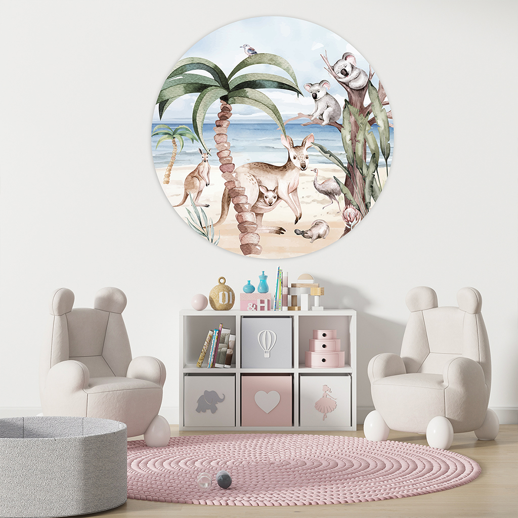 De muurcirkel Aussie jungle is onderdeel van de collectie muurcirkel kinderkamer. Breng de natuurlijke schoonheid van Australië in huis met Aussie Jungle, een betoverend jungle schilderij op muurcirkel. Dit kunstwerk toont een speelse verzameling Australische dieren — van kangoeroes en koala’s tot tropische vogels — omringd door palmen en bloemen. Het ronde ontwerp geeft dit schilderij jungle een zachte, moderne uitstraling die perfect past in kinderkamers of speelse woonruimtes. De warme kleuren en vrolijke details maken van Aussie Jungle een uniek schilderij jungle dieren dat sfeer en harmonie uitstraalt. Of je nu op zoek bent naar een stijlvolle muurdecoratie of een kleurrijk accent, deze muurcirkel brengt de tropische jungle tot leven in elke kamer.