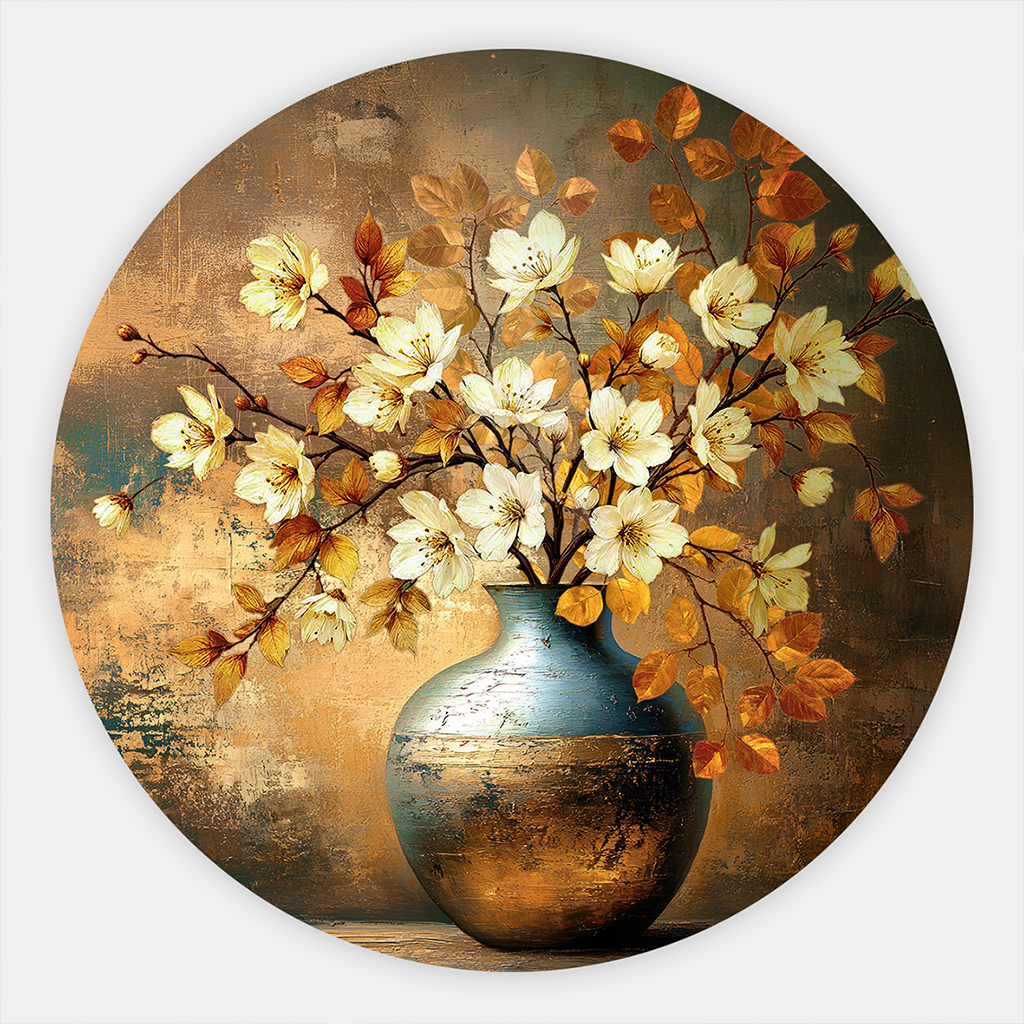 De muurcirkel Autumn whispers is onderdeel van de collectie muurcirkel bloemen. Deze betoverende muurcirkel bloemen combineert de charme van klassieke schilderkunst met een moderne, ronde vorm. De sierlijke bloemen in vaas zijn weergegeven in warme goud- en bruintinten, wat zorgt voor een sfeervolle uitstraling in elke ruimte. Het ronde ontwerp van dit rond schilderij bloemen maakt het kunstwerk een echte blikvanger — perfect als elegante wandcirkel bloemen boven de bank, in de hal of slaapkamer. De verfijnde details en harmonieuze kleuren geven dit stilleven met bloemen een tijdloze klasse. Of je nu een romantisch accent zoekt of juist een vleugje luxe wilt toevoegen aan je interieur, dit vaas met bloemen schilderij past moeiteloos in elk woonstijl — van modern tot klassiek. Dit kunstwerk is verkrijgbaar in diverse uitvoeringen, waaronder wanddecoratie goud op Aluminium Dibond, Plexiglas, Forex of Geborsteld aluminium. Dankzij de hoogwaardige afwerking en diepe kleuren geniet je jarenlang van een stijlvolle eyecatcher aan de muur. Een prachtig bloemen schilderij dat warmte, elegantie en rust brengt — ideaal voor wie houdt van kunst met een vleugje luxe.