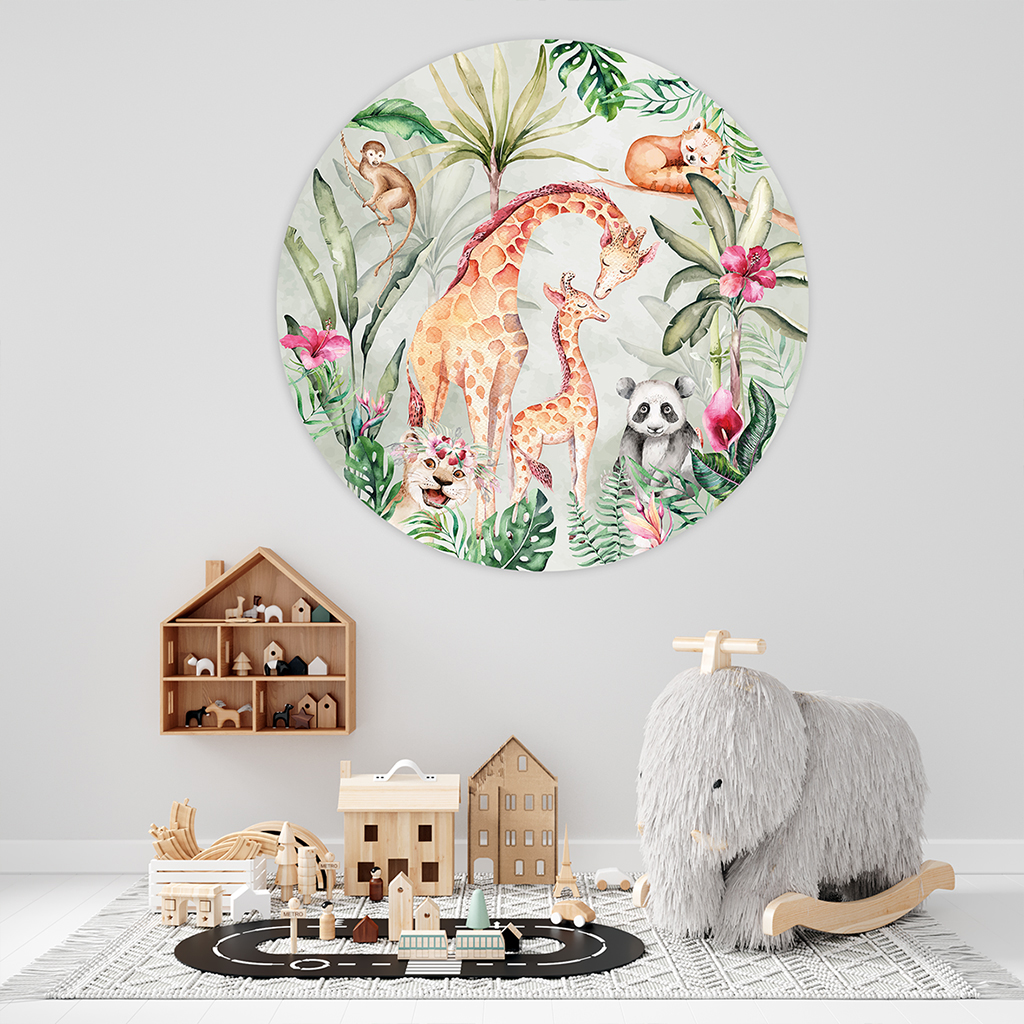 De muurcirkel Jungle hugs is onderdeel van de collectie muurcirkel kinderkamer schilderij. Ontdek de magie van de natuur met deze betoverende muurcirkel jungle – een prachtig jungle schilderij speciaal ontworpen voor de kinderkamer. Dit ronde kunstwerk toont schattige jungle dieren zoals giraffen, panda’s en apen, omringd door tropisch groen en bloemen. De zachte tinten en liefdevolle details maken dit schilderij jungle dieren perfect voor een warme, avontuurlijke sfeer. Als schilderij kinderkamer brengt het rust en vrolijkheid tegelijk, ideaal voor boven het bed, de commode of speelhoek. Dankzij het ronde ontwerp is dit jungle schilderij kinderkamer niet alleen trendy, maar ook tijdloos. Laat de verbeelding van je kleintje groeien met deze vrolijke wanddecoratie jungle dieren vol kleur en vriendelijkheid.