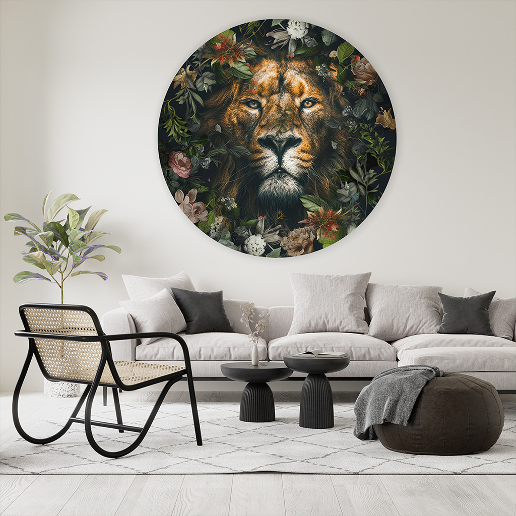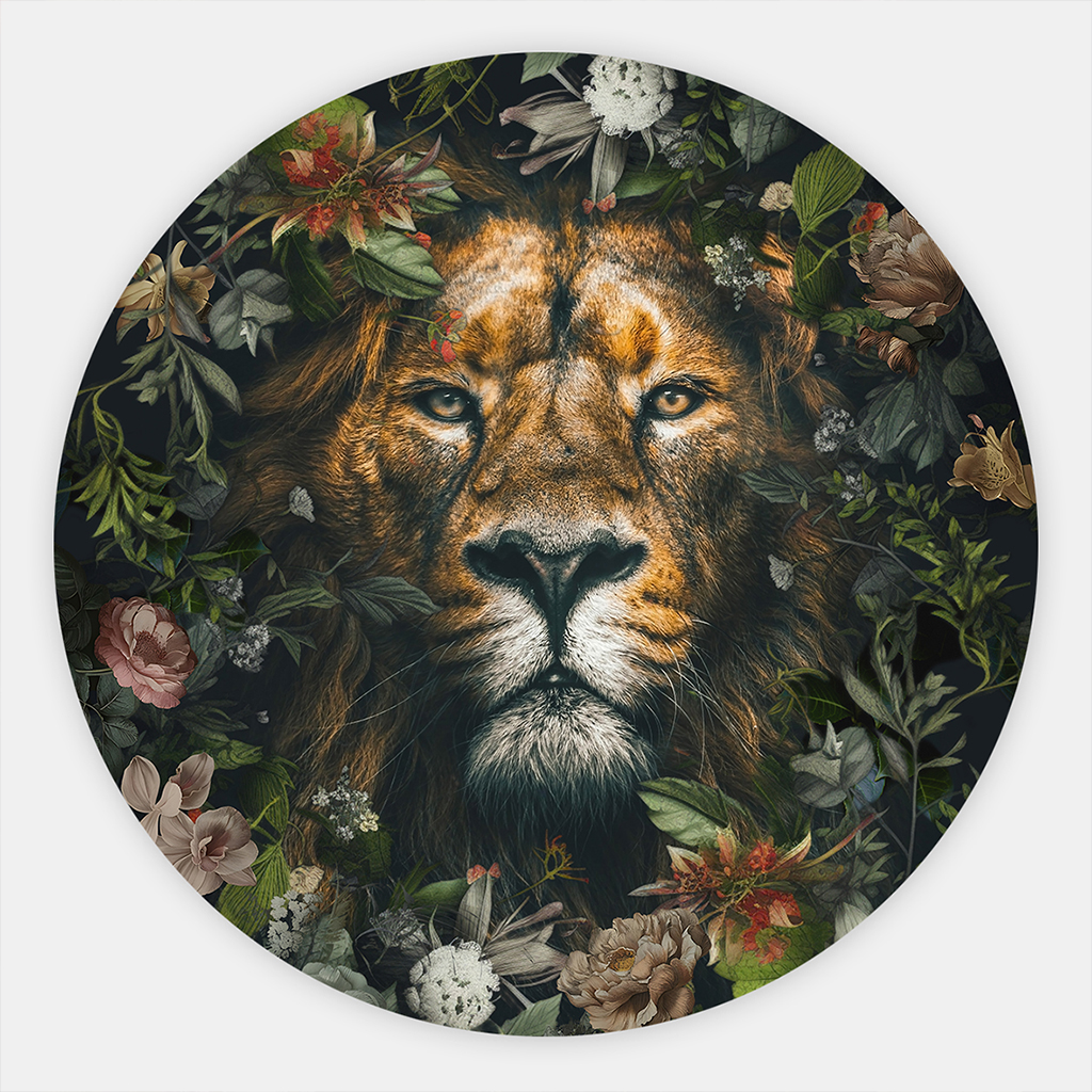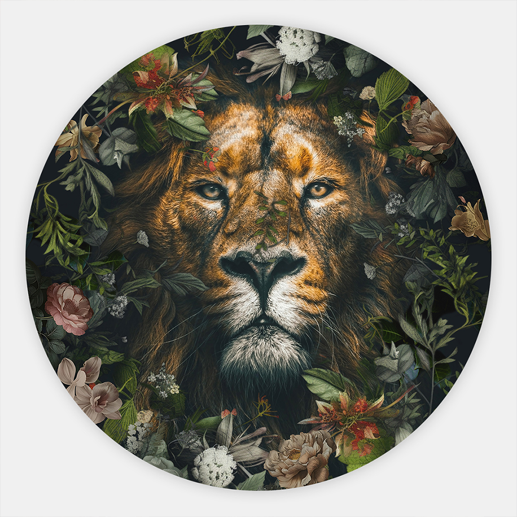 De muurcirkel Leeuw met bloemen is onderdeel van de collectie muurcirkel dieren. Verrijk je interieur met de betoverende kracht van deze Leeuw met bloemen muurcirkel — een kunstwerk waarin stoer dierenportret en zachte botanische elementen prachtig samenkomen. De intense blik van de leeuw, omringd door sierlijke bloemen en bladeren, maakt dit rond schilderij tot een echte eyecatcher in iedere ruimte. Deze muurcirkel past perfect binnen moderne, botanische en luxe woonstijlen en is ideaal als muurcirkel leeuw, schilderij leeuw, bloemen en dieren wanddecoratie of stijlvolle rond wandpaneel leeuw. Dankzij de ronde vorm krijgt het kunstwerk een zachte, elegante uitstraling die elke muur direct meer diepte en sfeer geeft. Of je dit kunstwerk gebruikt als krachtige blikvanger boven de bank, als sfeermaker in de slaapkamer, of als stijlvolle decoratie in een kantoor of entree — de Leeuw met bloemen muurcirkel brengt altijd karakter, rust en verfijning aan je interieur.