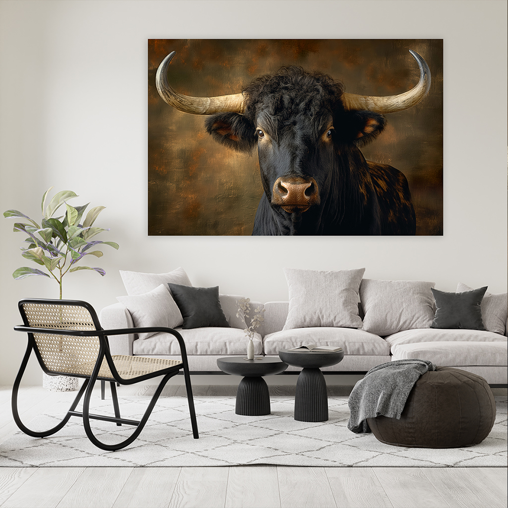 Dit dieren schilderij is zeer geschikt voor liefhebbers van natuur, wildlife en expressieve kunst. De stier staat niet alleen voor fysieke kracht, maar ook voor stabiliteit en karakter, wat dit werk extra betekenis geeft binnen de ruimte waarin het hangt. Als schilderij print wordt het kunstwerk haarscherp weergegeven, met veel diepte en nuance in textuur en kleur.